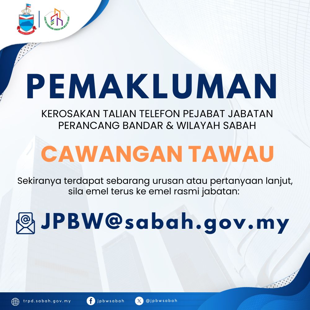 KEROSAKAN TALIAN TELEFON PEJABAT JABATAN PERANCANG BANDAR & WILAYAH SABAH - Cawangan Tawau Details Attachments https://announcement.sabah.gov.my/static/uploads/HcytKBoE_20260406.jpg Category Pengumuman Image URL https://announcement.sabah.gov.my/static/uploads/3UTKI6LD_20260406.jpeg